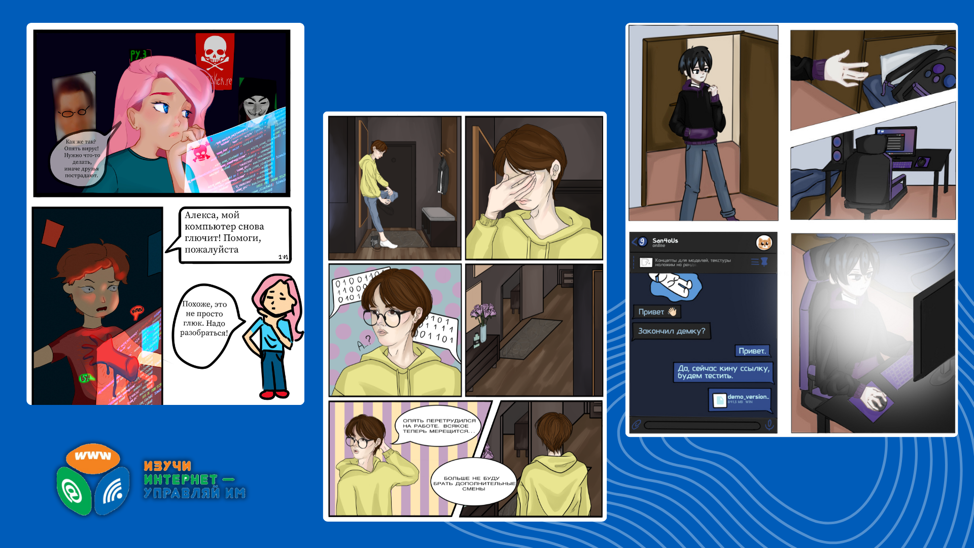 • 1 место – команда Московского колледжа транспорта, подготовившая сценарий и фреймы комикса для подростков «Тени кода: Битва с вредоносами»
